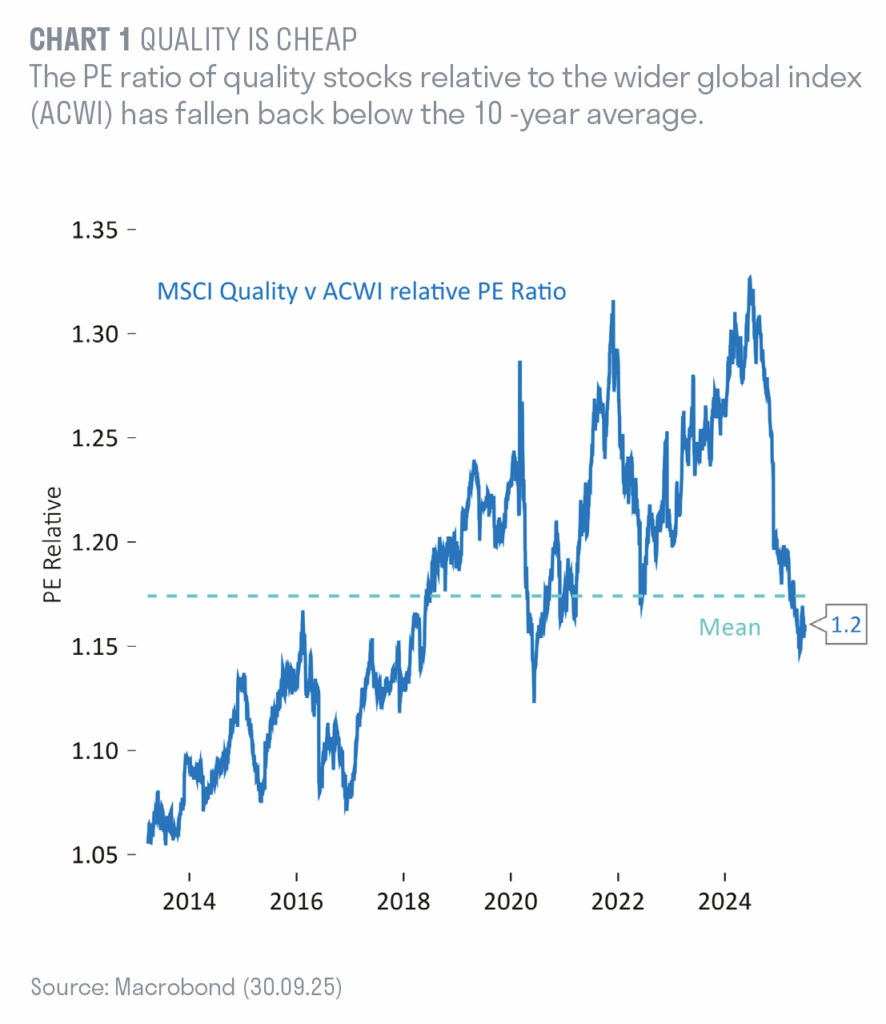 That leaves us with a familiar choice: join the rush into high-beta, speculative equities, or stay disciplined with our quality, thematic holdings. We remain committed to the latter – defined as companies with high returns on equity, steady year-on-year earnings growth and low financial leverage. Encouragingly, the MSCI World Quality Index[2] has begun to show signs of recovery over the past month, even as risks build in the frothier corners of global markets (chart 1).