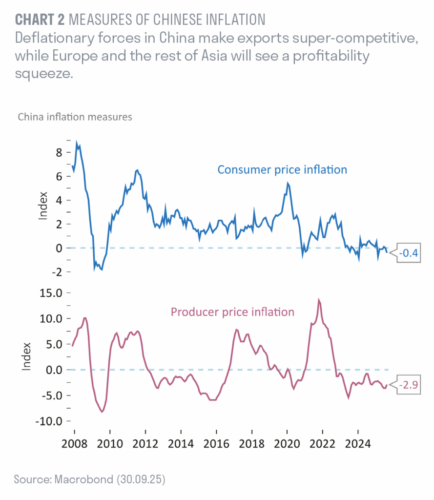China faces a quite different challenge – but one that also argues for caution in equity selection. The economy continues to wrestle with structural deflation, centred on the property sector (chart 2). Consumer and factory-gate prices remain negative, and exports to the US have slowed. A further round of fiscal and monetary stimulus is likely in early 2026, albeit reluctantly adopted.